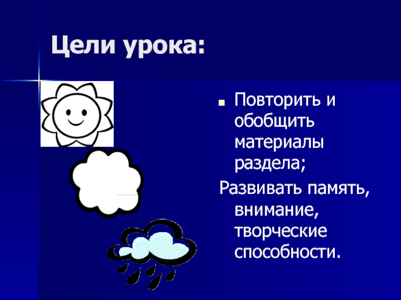 Цели урока:Повторить и обобщить материалы раздела;Развивать память, внимание, творческие способности.