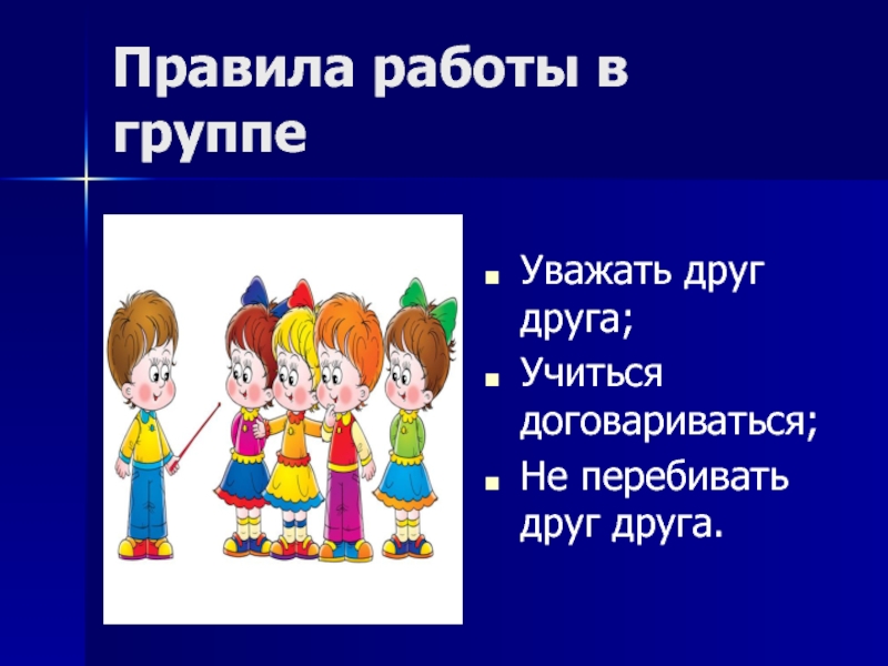 Правила работы в группеУважать друг друга;Учиться договариваться;Не перебивать друг друга.