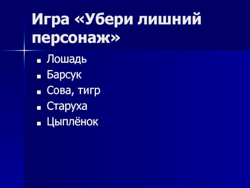 Игра «Убери лишний персонаж»ЛошадьБарсукСова, тигрСтарухаЦыплёнок