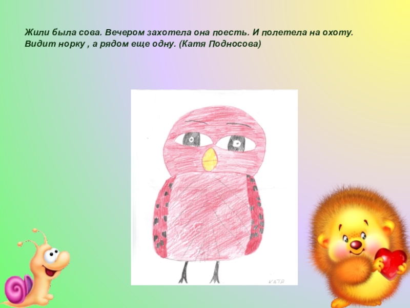 Жили была сова. Вечером захотела она поесть. И полетела на охоту. Видит норку , а рядом еще