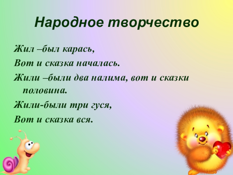 Народное творчествоЖил –был карась,Вот и сказка началась.Жили –были два налима, вот и сказки половина.Жили-были три гуся,Вот и