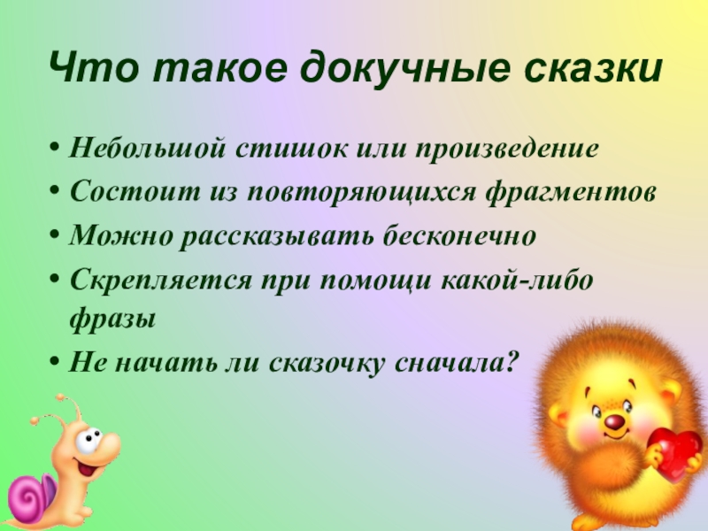 Что такое докучные сказкиНебольшой стишок или произведениеСостоит из повторяющихся фрагментовМожно рассказывать бесконечноСкрепляется при помощи какой-либо фразыНе начать ли сказочку сначала?