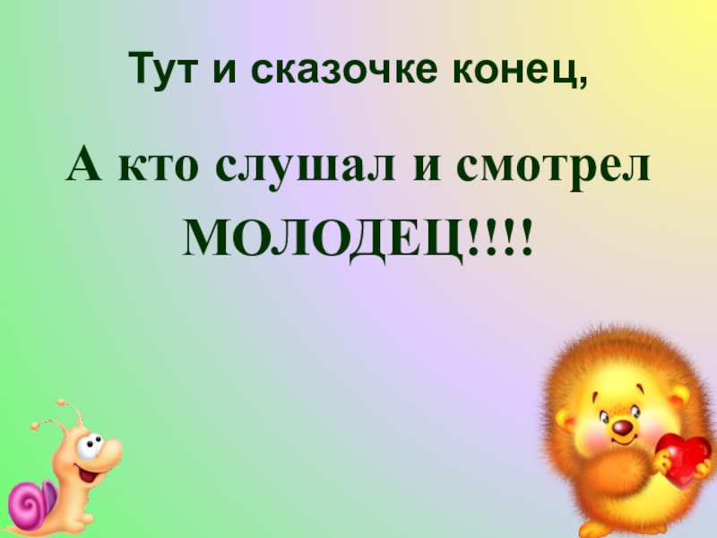 Тут и сказочке конец,А кто слушал и смотрелМОЛОДЕЦ!!!!