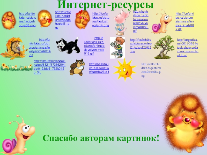 Интернет-ресурсыhttp://funforkids.ru/pictures/hedgehog/ej08.pnghttp://funforkids.ru/pictures/hedgehog/ej11.pnghttp://funforkids.ru/pictures/hedgehog/ej14.pnghttp://funforkids.ru/pictures/animals/lovelyanimals086.gifhttp://funforkids.ru/pictures/animals/lovelyanimals087.gifhttp://funforkids.ru/pictures/animals/lovelyanimals014.gifhttp://funforkids.ru/pictures/animals/lovelyanimals016.gifhttp://funforkids.ru/pictures/school21/school21062.jpghttp://img-fotki.yandex.ru/get/6521/37366204.eb/0_93dc6_762b015b_XLhttp://artgrafica.net/2011/09/14/stock-photo-collection-trees-isolated.htmlhttp://priroda.inc.ru/animation/bambi/26.gifhttp://allforchildren.ru/pictures/sun2/sun087.pngСпасибо авторам картинок!