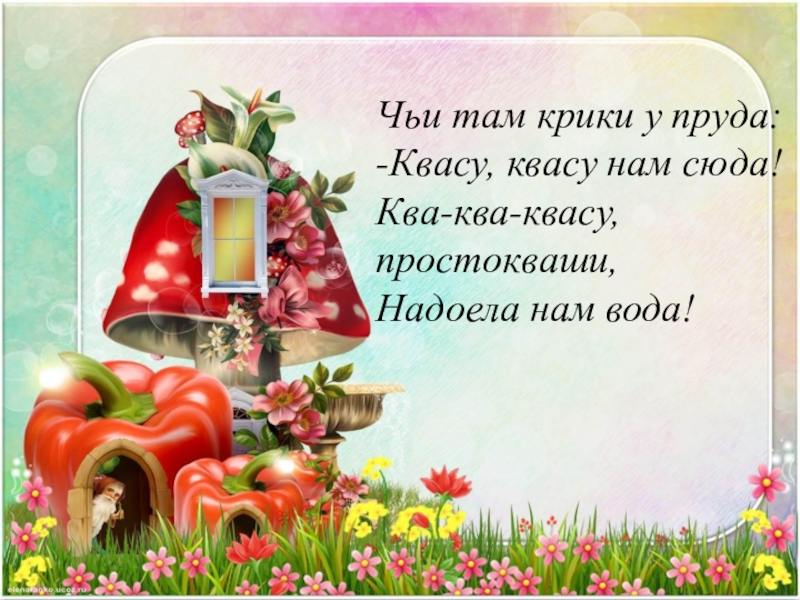 Чьи там крики у пруда:-Квасу, квасу нам сюда!Ква-ква-квасу, простокваши,Надоела нам вода!