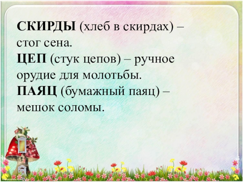 СКИРДЫ (хлеб в скирдах) – стог сена.ЦЕП (стук цепов) – ручное орудие для молотьбы.ПАЯЦ (бумажный паяц) –