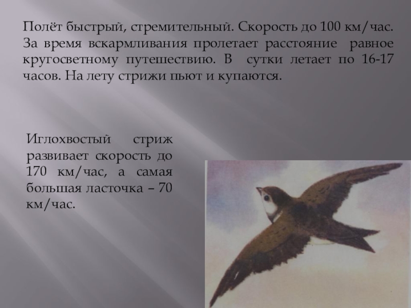 Иглохвостый стриж развивает скорость до 170 км/час, а самая большая ласточка – 70 км/час.