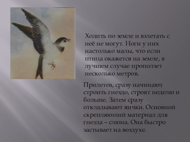 Прилетев, сразу начинают строить гнездо, строят неделю и больше. Затем сразу откладывают яички. Основной скрепляющий материал для гнезда – слюна. Она быстро застывает на воздухе.