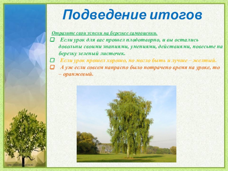Подведение итоговОтразите свои успехи на березкее самооценки. Если урок для вас прошел плодотворно, и вы остались довольны