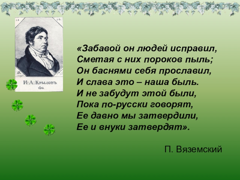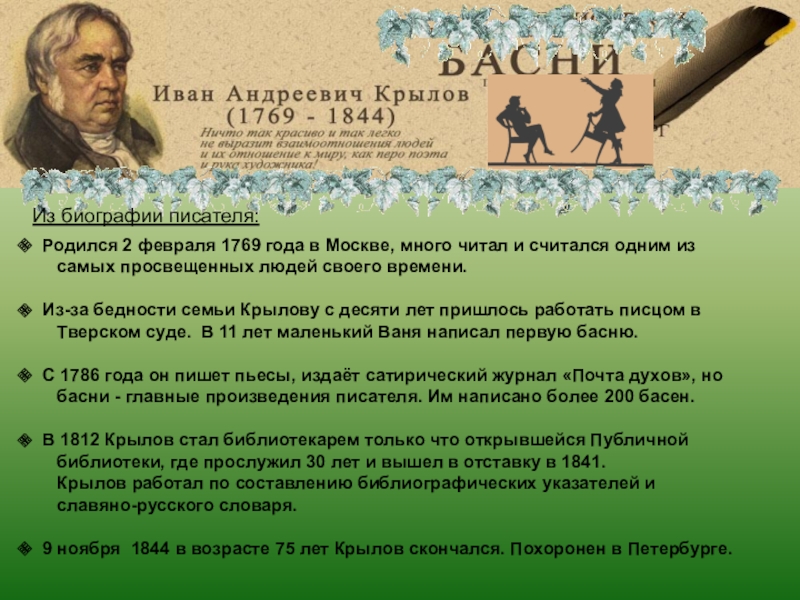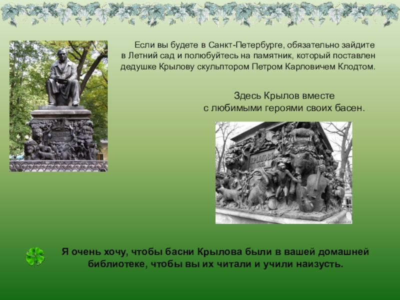 Я очень хочу, чтобы басни Крылова были в вашей домашней библиотеке, чтобы вы их читали и учили наизусть.