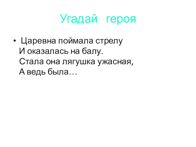 И оказалась на балу. Стала она лягушка ужасная, А ведь была…