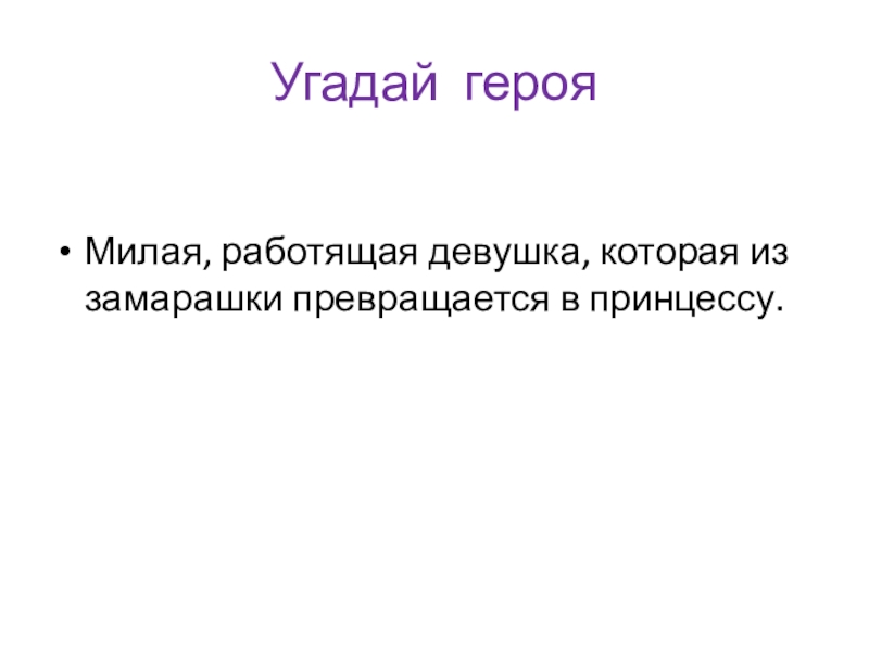 Угадай герояМилая, работящая девушка, которая из замарашки превращается в принцессу.