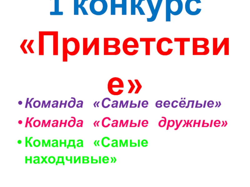 1 конкурс «Приветствие»Команда «Самые весёлые»Команда «Самые дружные»Команда «Самые находчивые»