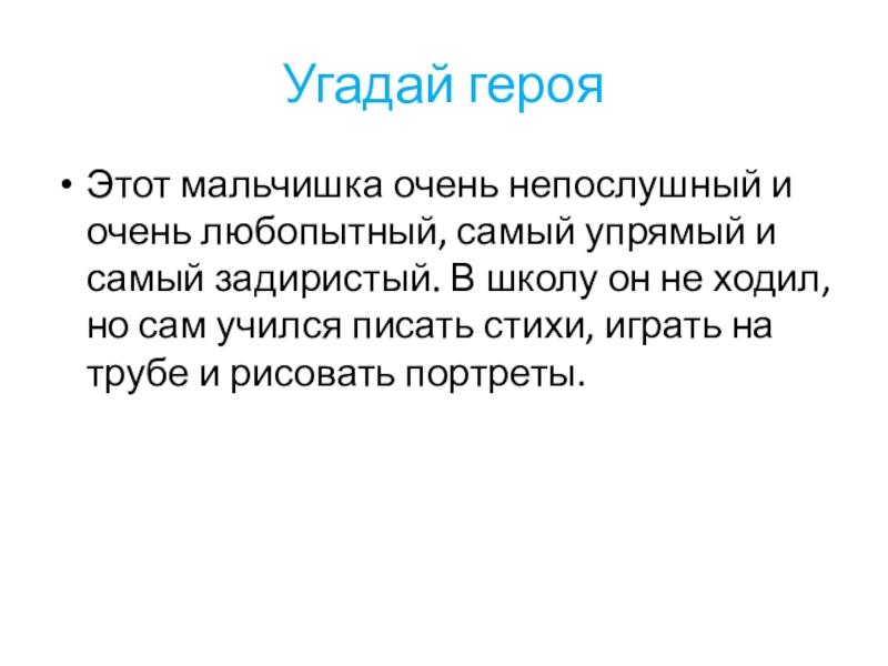 Угадай герояЭтот мальчишка очень непослушный и очень любопытный, самый упрямый и самый задиристый. В школу он не