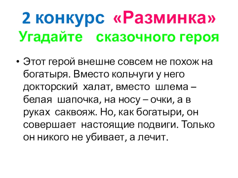 2 конкурс «Разминка» Угадайте  сказочного герояЭтот герой внешне совсем не похож на богатыря. Вместо кольчуги у