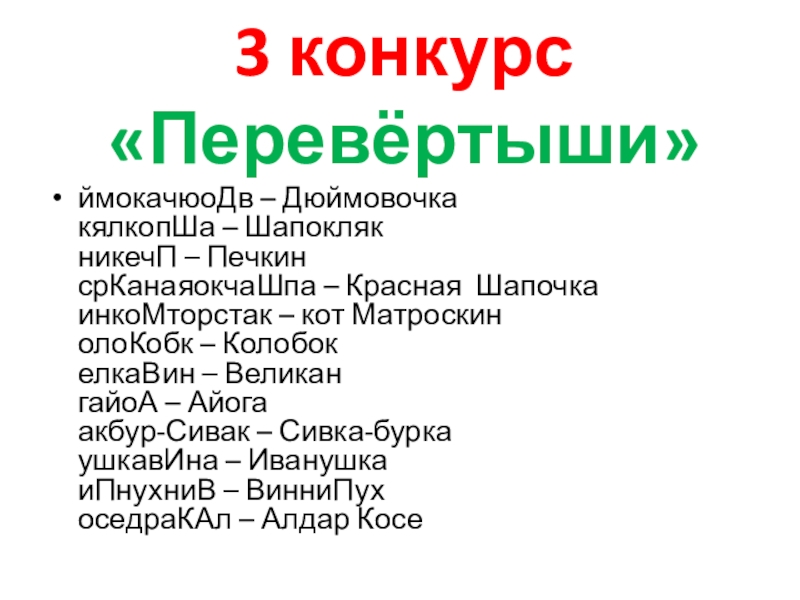 3 конкурс  «Перевёртыши»ймокачюоДв – Дюймовочка