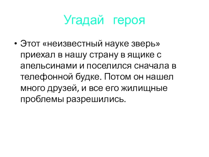 Угадай  герояЭтот «неизвестный науке зверь» приехал в нашу страну в ящике с апельсинами и поселился сначала