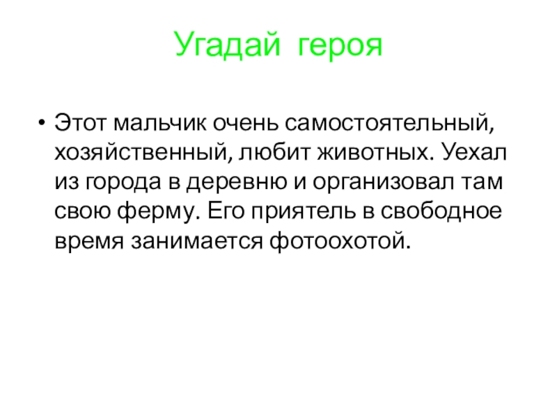 Угадай герояЭтот мальчик очень самостоятельный, хозяйственный, любит животных. Уехал из города в деревню и организовал там свою