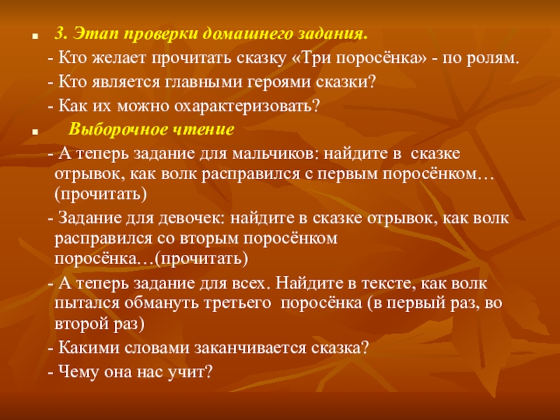 - Задание для девочек: найдите в сказке отрывок, как волк расправился со вторым поросёнком поросёнка…(прочитать)