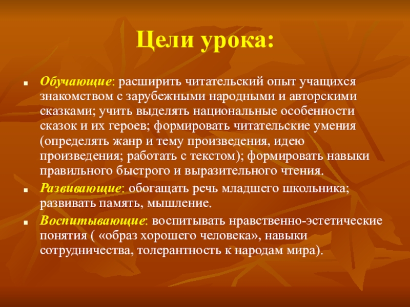 Обучающие: расширить читательский опыт учащихся знакомством с зарубежными народными