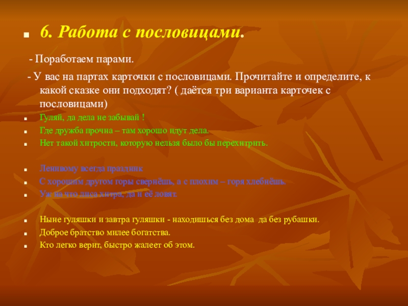 партах карточки с пословицами. Прочитайте и определите, к какой сказке они подходят? ( даётся три варианта карточек с пословицами)
