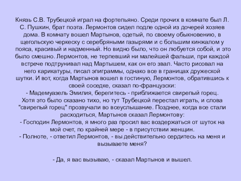 Хотя это было сказано тихо, но тут Трубецкой перестал играть, и слова "свирепый горец" прозвучали во всеуслышание. Позднее, когда все стали расходиться, Мартынов сказал Лермонтову: