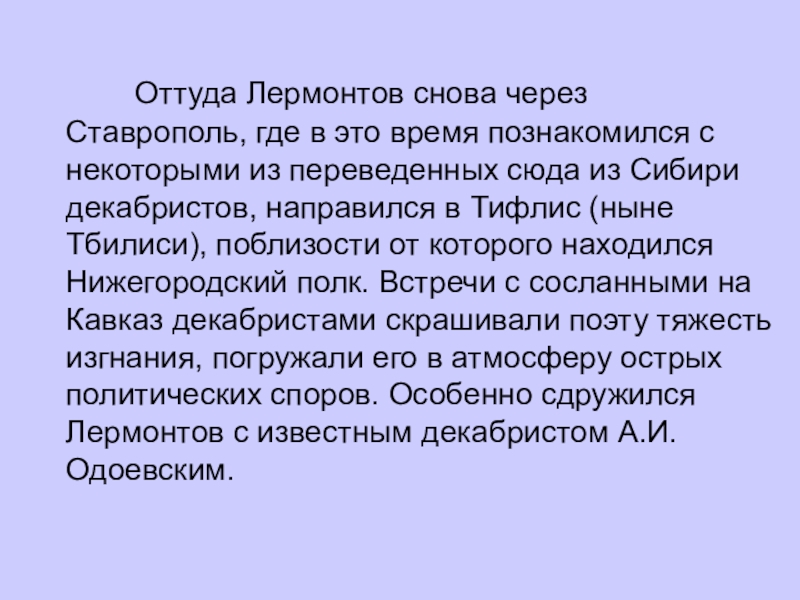 Лермонтов снова через Ставрополь, где в это время познакомился с некоторыми из переведенных сюда из Сибири декабристов, направился в Тифлис (ныне Тбилиси), поблизости от которого находился Нижегородский полк. Встречи с сосланными на Кавказ декабристами скрашивали поэту тяжесть изгнания, погружали его в атмосферу острых политических споров. Особенно сдружился Лермонтов с известным декабристом А.И.Одоевским.