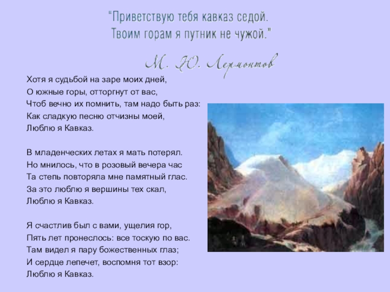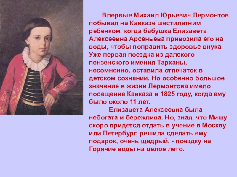 Кавказе шестилетним ребенком, когда бабушка Елизавета Алексеевна Арсеньева привозила его на воды, чтобы поправить здоровье внука. Уже первая поездка из далекого пензенского имения Тарханы, несомненно, оставила отпечаток в детском сознании. Но особенно большое значение в жизни Лермонтова имело посещение Кавказа в 1825 году, когда ему было около 11 лет.