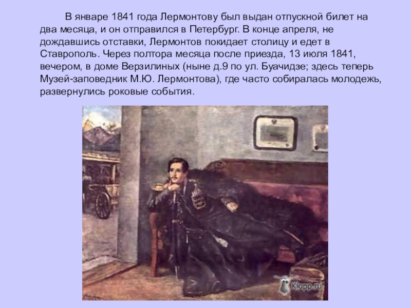 года Лермонтову был выдан отпускной билет на два месяца, и он отправился в Петербург. В конце апреля, не дождавшись отставки, Лермонтов покидает столицу и едет в Ставрополь. Через полтора месяца после приезда, 13 июля 1841, вечером, в доме Верзилиных (ныне д.9 по ул. Буачидзе; здесь теперь Музей-заповедник М.Ю. Лермонтова), где часто собиралась молодежь, развернулись роковые события.