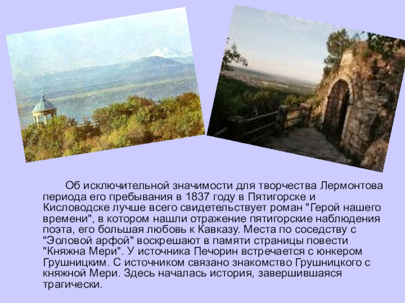 периода его пребывания в 1837 году в Пятигорске и Кисловодске лучше всего свидетельствует роман "Герой нашего времени", в котором нашли отражение пятигорские наблюдения поэта, его большая любовь к Кавказу. Места по соседству с "Эоловой арфой" воскрешают в памяти страницы повести "Княжна Мери". У источника Печорин встречается с юнкером Грушницким. С источником связано знакомство Грушницкого с княжной Мери. Здесь началась история, завершившаяся трагически.
