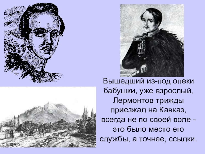 Слайд 4Вышедший из-под опеки бабушки, уже взрослый, Лермонтов трижды приезжал на Кавказ,