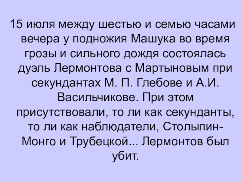 Машука во время грозы и сильного дождя состоялась дуэль Лермонтова с Мартыновым при секундантах М. П. Глебове и А.И. Васильчикове. При этом присутствовали, то ли как секунданты, то ли как наблюдатели, Столыпин-Монго и Трубецкой... Лермонтов был убит.