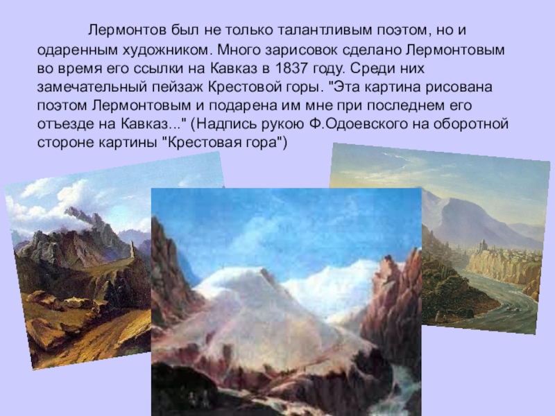 поэтом, но и одаренным художником. Много зарисовок сделано Лермонтовым во время его ссылки на Кавказ в 1837 году. Среди них замечательный пейзаж Крестовой горы. "Эта картина рисована поэтом Лермонтовым и подарена им мне при последнем его отъезде на Кавказ..." (Надпись рукою Ф.Одоевского на оборотной стороне картины "Крестовая гора")