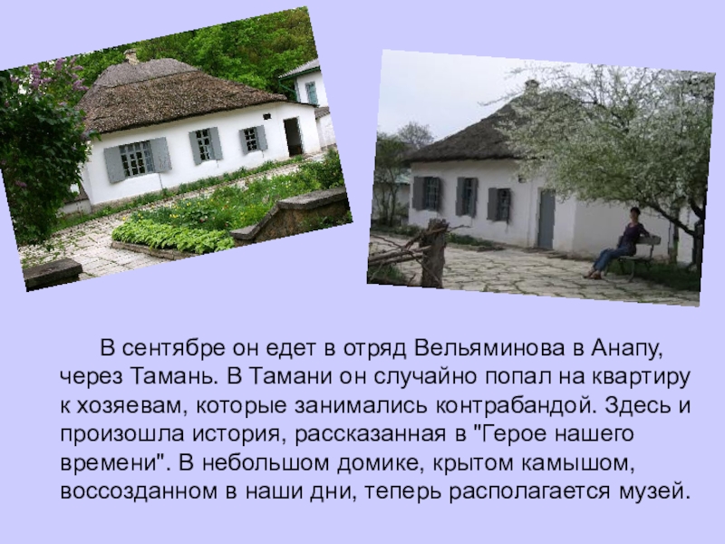 Вельяминова в Анапу, через Тамань. В Тамани он случайно попал на квартиру к хозяевам, которые занимались контрабандой. Здесь и произошла история, рассказанная в "Герое нашего времени". В небольшом домике, крытом камышом, воссозданном в наши дни, теперь располагается музей.