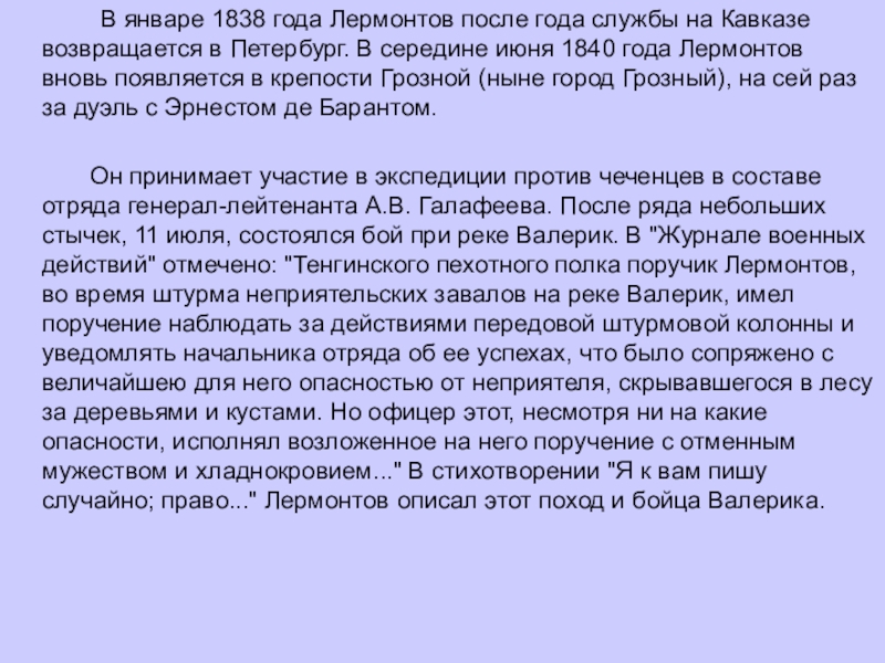 Он принимает участие в экспедиции против чеченцев в составе отряда генерал-лейтенанта А.В. Галафеева. После ряда небольших стычек, 11 июля, состоялся бой при реке Валерик. В "Журнале военных действий" отмечено: "Тенгинского пехотного полка поручик Лермонтов, во время штурма неприятельских завалов на реке Валерик, имел поручение наблюдать за действиями передовой штурмовой колонны и уведомлять начальника отряда об ее успехах, что было сопряжено с величайшею для него опасностью от неприятеля, скрывавшегося в лесу за деревьями и кустами. Но офицер этот, несмотря ни на какие опасности, исполнял возложенное на него поручение с отменным мужеством и хладнокровием..." В стихотворении "Я к вам пишу случайно; право..." Лермонтов описал этот поход и бойца Валерика.