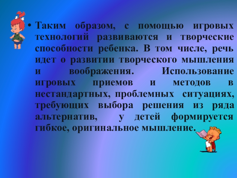 Слайд 12Таким образом, с помощью игровых технологий развиваются и творческие способности ребенка.