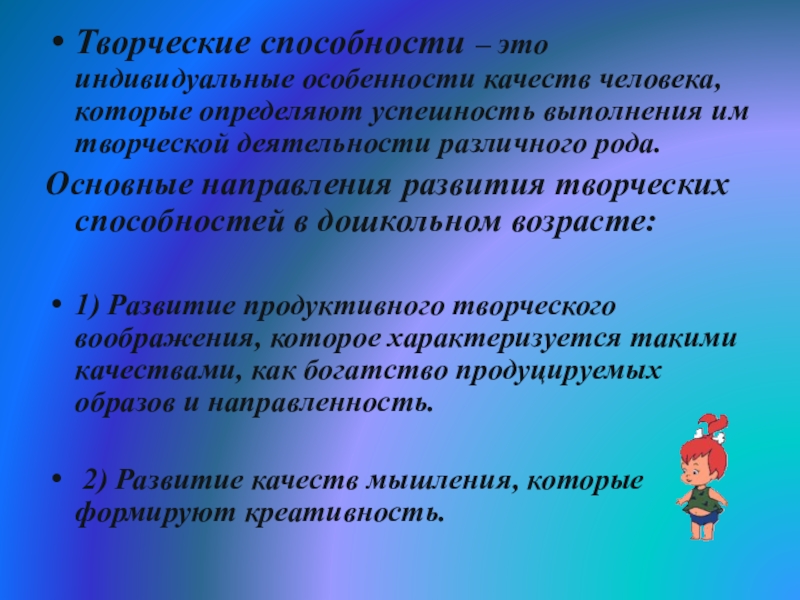 Слайд 2Творческие способности – это индивидуальные особенности качеств человека, которые определяют успешность