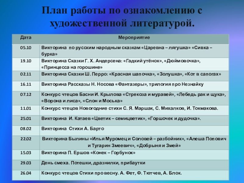 Слайд 14План работы по ознакомлению с художественной литературой.