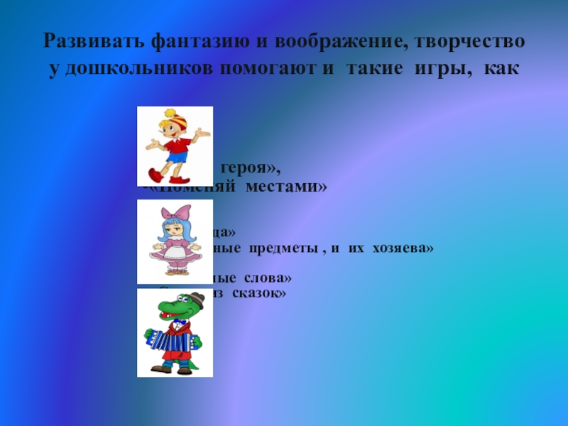 Слайд 10Развивать фантазию и воображение, творчество у дошкольников помогают и такие