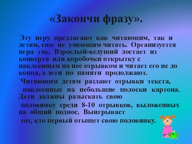 и детям, еще не умеющим читать. Организуется игра так. Взрослый-ведущий достает из конверта или коробочки открытку с наклеенным на нее отрывком и читает его не до конца, а дети по памяти продолжают.