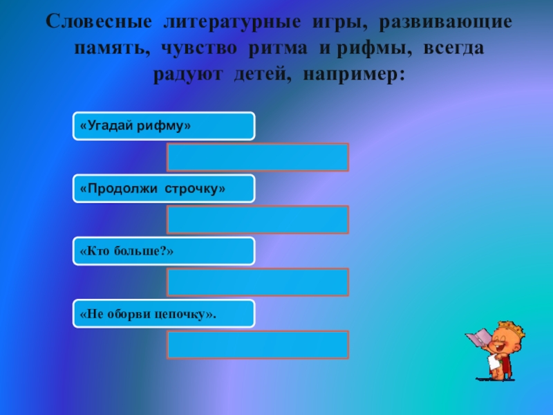 Слайд 4Литературные игры – эффективное средство развития творческих способностей ребенка: