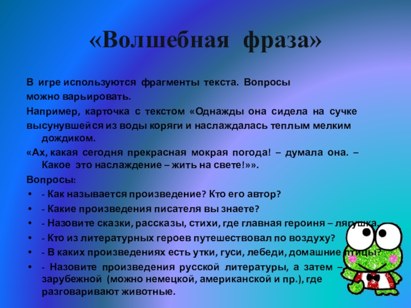 - Назовите сказки, рассказы, стихи, где главная героиня – лягушка.
