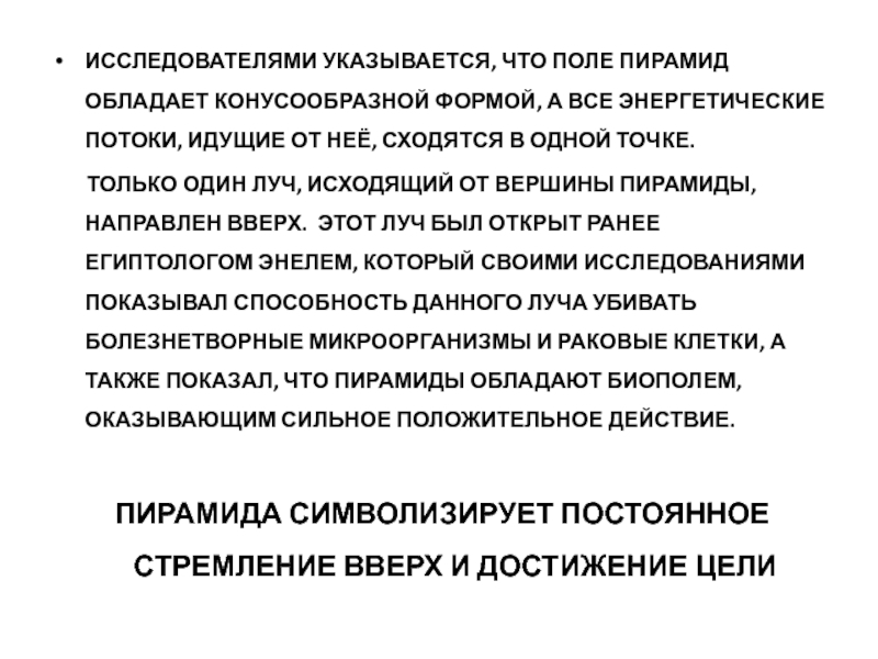 Слайд 10Исследователями указывается, что поле пирамид обладает конусообразной формой, а все энергетические