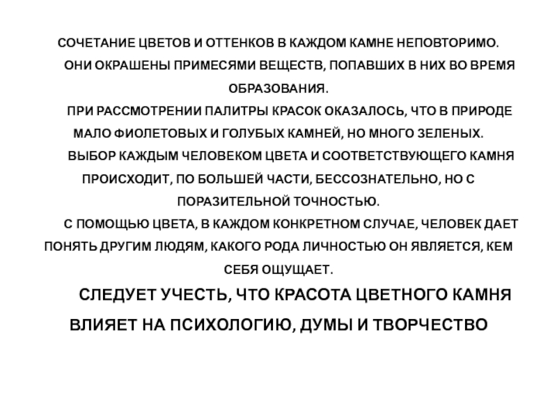 Следует учесть, что красота цветного камня влияет на психологию, думы и творчество