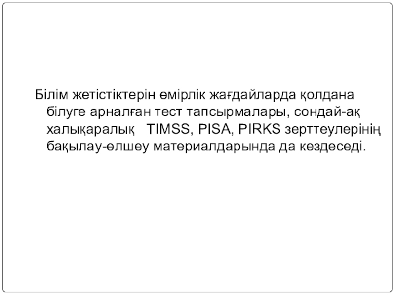 Білім жетістіктерін өмірлік жағдайларда қолдана білуге арналған тест тапсырмалары, сондай-ақ халықаралық