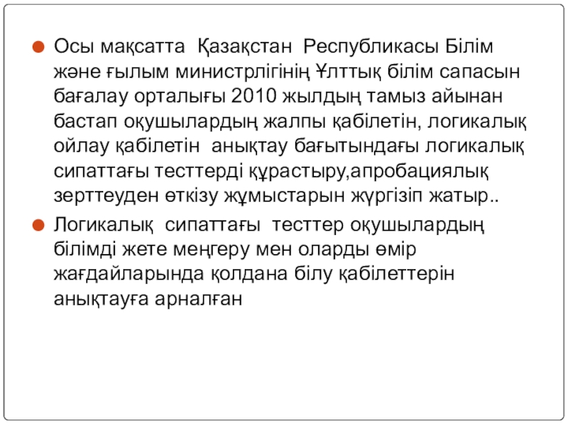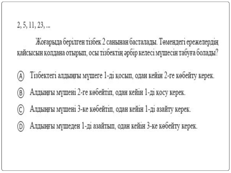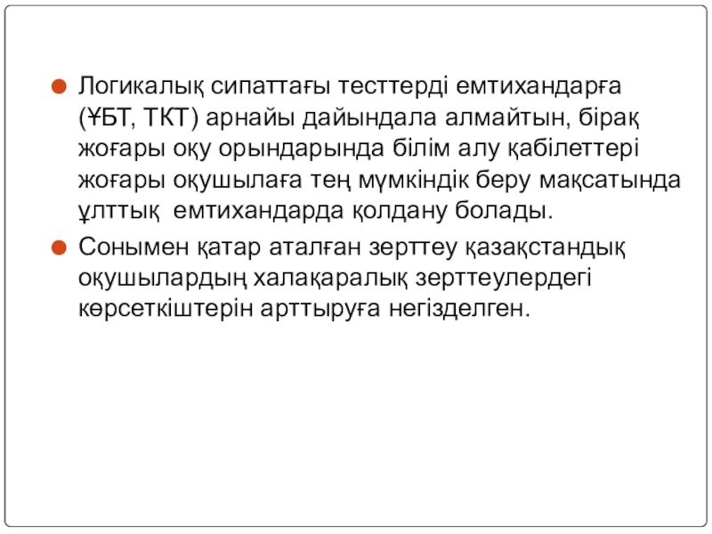 Слайд 6Логикалық сипаттағы тесттерді емтихандарға (ҰБТ, ТКТ) арнайы дайындала алмайтын, бірақ