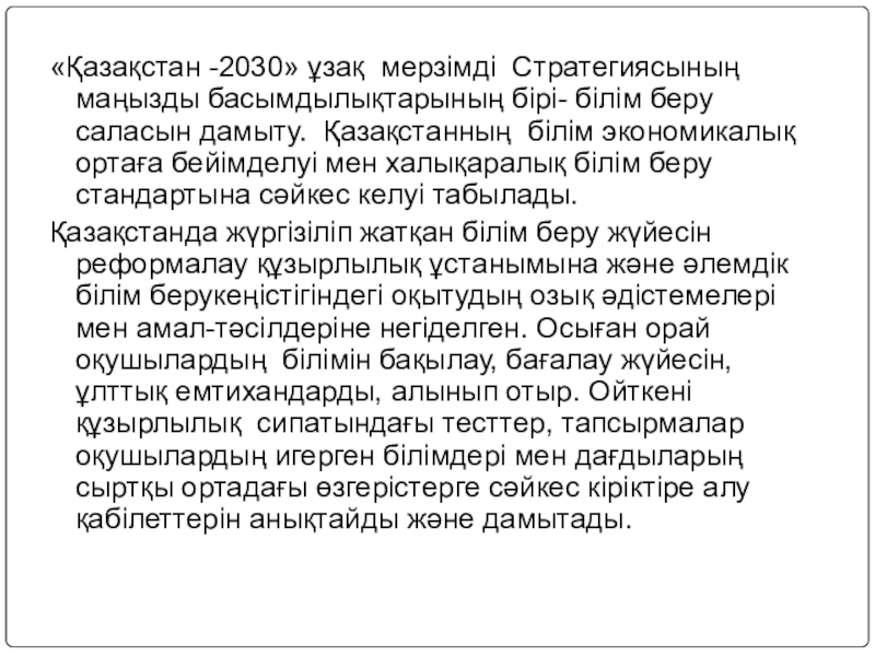 Слайд 2«Қазақстан -2030» ұзақ мерзімді Стратегиясының маңызды басымдылықтарының бірі- білім беру саласын