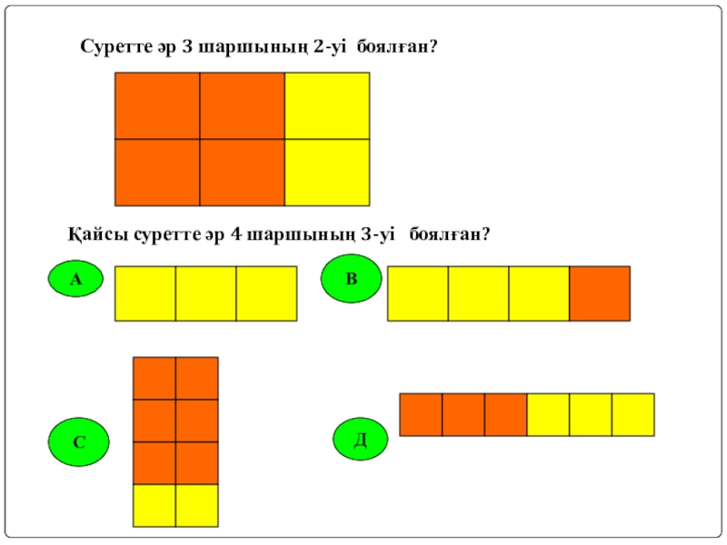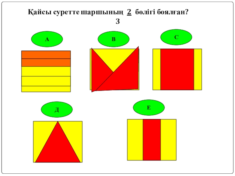 Қайсы суретте шаршының 2 бөлігі боялған?