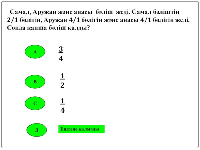 Самал, Аружан және анасы бәліш жеді. Самал бәліштің 2/1 бөлігін,