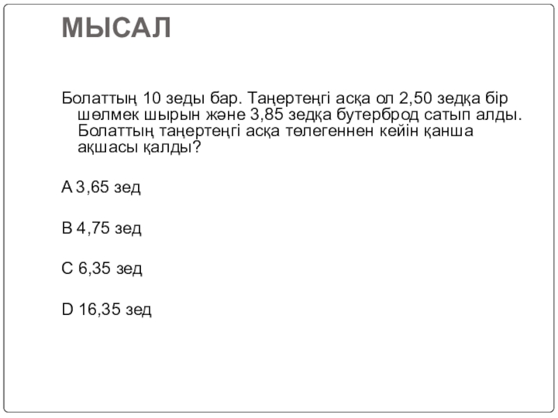 Болаттың 10 зеды бар. Таңертеңгі асқа ол 2,50 зедқа бір шөлмек